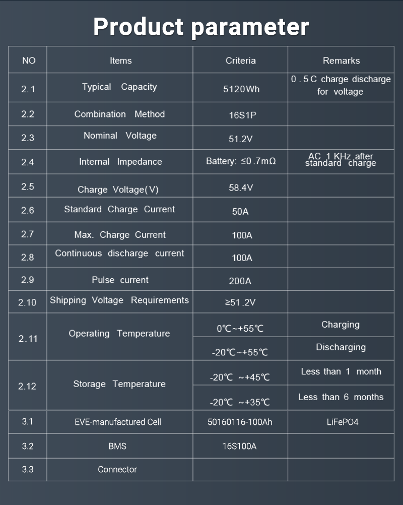 - Nominal Capacity: 100Ah 0.5C