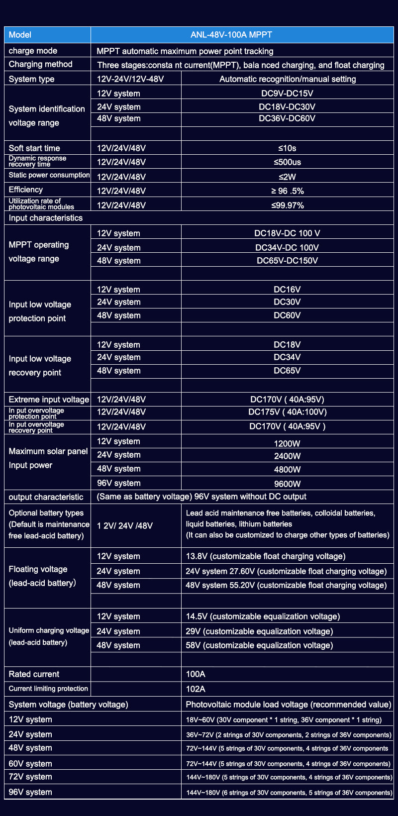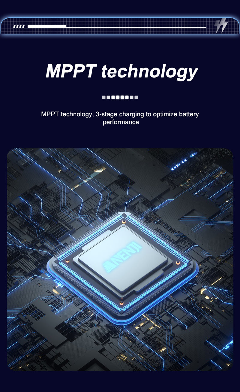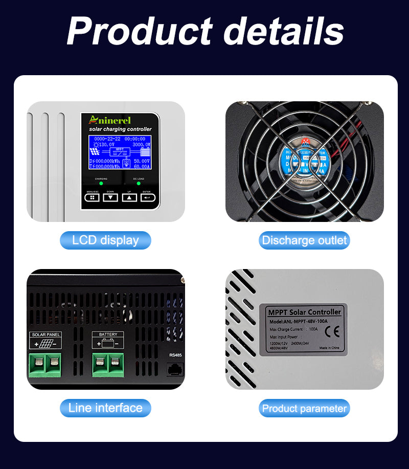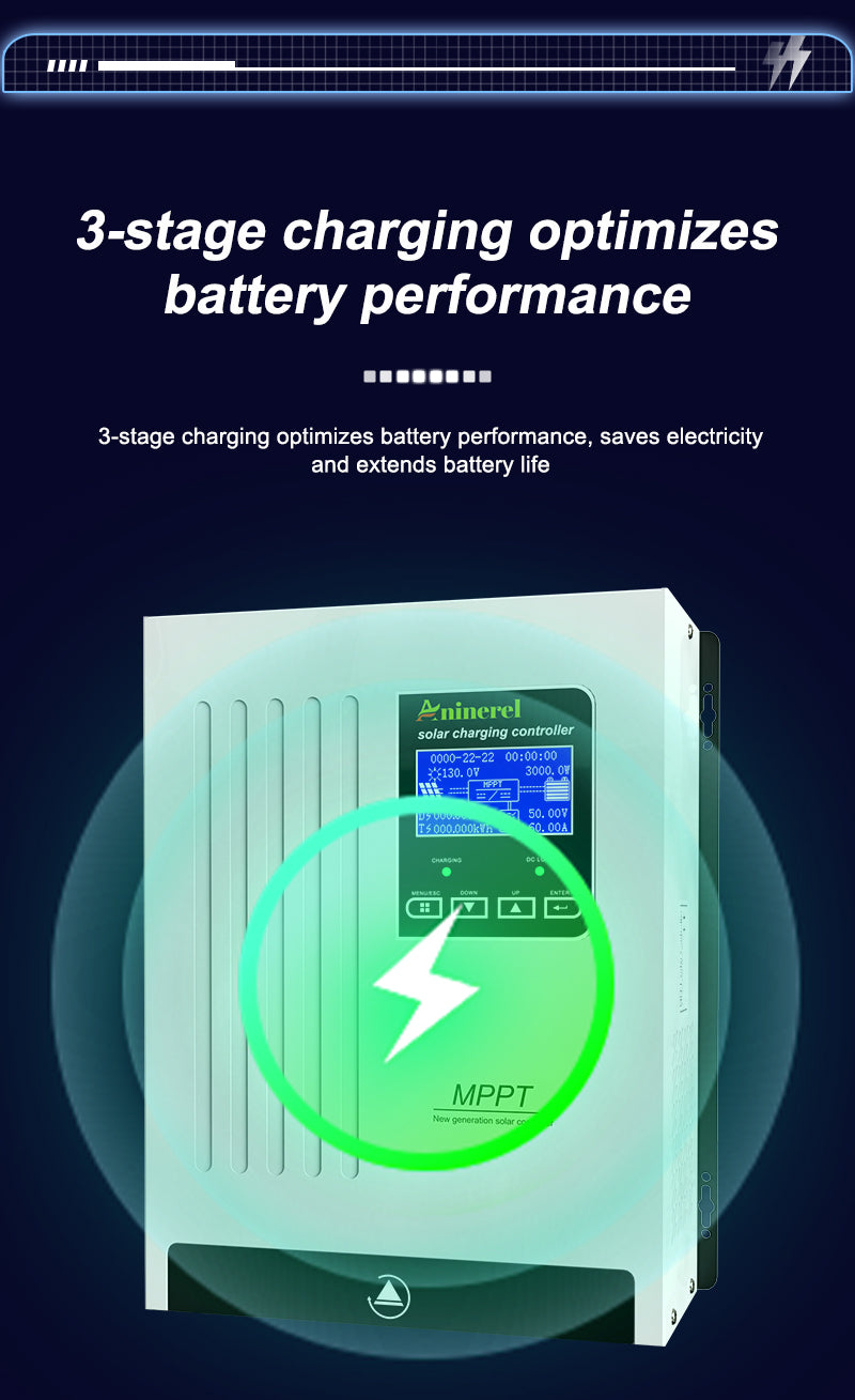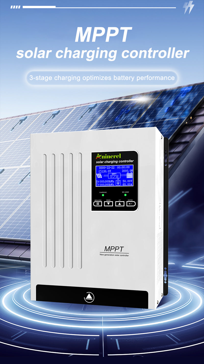 Aninerel 100A MPPT Solar Charge Controller is a high-efficiency solar regulator with auto-adapt 12V/24V/36V/48V, max 150V PV input. Equipped with back-light LCD display, it provides stable battery charging, full safety protections, and is ideal for various solar power scenarios.